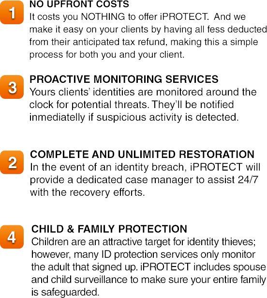 As millions of individuals become victims of identity theft each year, the need for optimized protection services increases. Through the iPROTECT affiliate program, your tax customers are able to better protect what matters most; namely their livelihood and ability to support their loved ones. With continuous monitoring, instant alert notifications, and 24/7 control, users can rest easy knowing they’re receiving complete protection from iPROTECT.